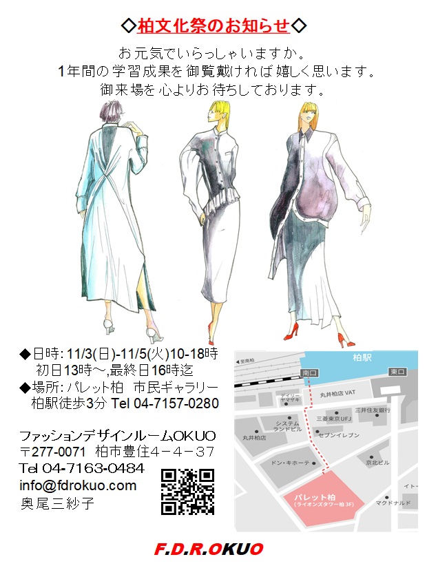 2024柏文化祭 作品展示のご案内 2024年10月7日 最終更新日時 : 2024年12月4日 ファッションデザインルームOKUO 期間:11月3日(日)~5日(火)10時~18時。初日13時~/最終日16時迄。 場所:JR柏駅徒歩3分 パレット柏 市民ギャラリー
